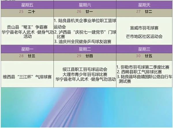 “七彩云南”全民健身赛事活动主要是以向各界宣传推荐具有地域特点、主题活动、云南特色的各类赛事活动,让群众有机会去了解身边的体育赛事并参与其中,也借助云南特色体育赛事活动向全国各地乃至世界各地人们认识、了解、喜欢云南。2024年6月主题活动围绕“七彩云南”全民健身赛事活动、“彩云之南”棋牌系列活动、三大球、云南省社区活动、以及中小学生运动会时序开展。