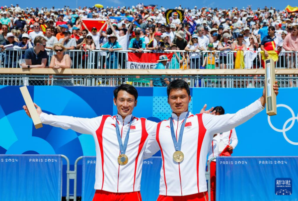 图为2024年8月8日刘浩(右)在巴黎奥运会皮划艇静水男子双人划艇500米决赛中夺得金牌。图源:新华社