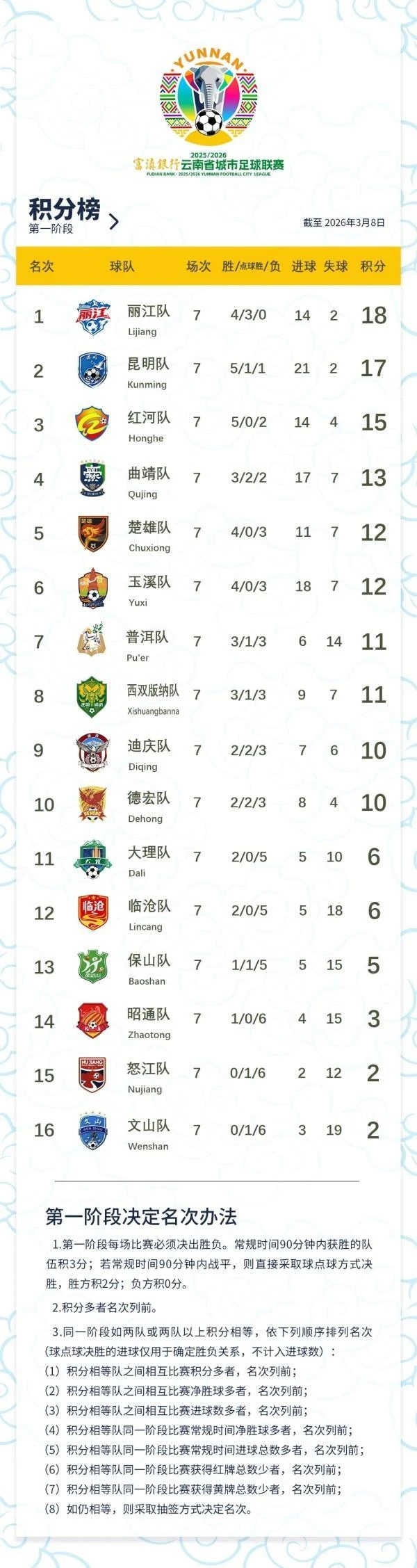 本轮战罢,积分榜梯队分化明显,丽江、昆明形成第一集团,红河、曲靖、楚雄、玉溪构成第二梯队,中游球队积分咬紧,下游球队则陷入连败困境。后续赛事中,各队的战术调整与状态起伏,将持续影响积分榜格局的走向。